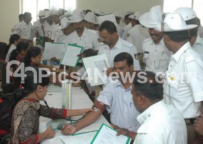 Photo Caption : Bangalore City Traffic Cops who are the most vulnerable to various diseases as they are exposed daily to air pollution-dust etc, underwent health check up jointly organised by Bangalore City Traffic and Fortis Hospital at day long Health Check up camp, at Traffic management Centre, Infantry Road, in Bangalore on Friday 12th September 2014