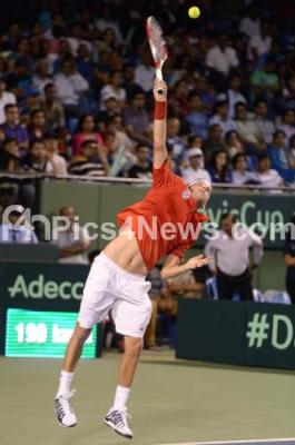 Photo Caption : Filip Krajinovic of Serbia Team in action against Somdev Devvarman of India, during the Davis Cup 2014, at KSLTA, in Bangalore on Friday 12th September 2014