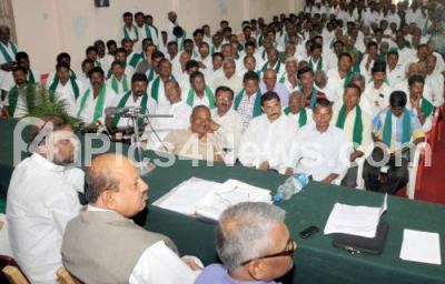 Photo Caption : Ministers H Anjanaiah and TB Jayachandra with Prof Raviverma Kumar discussing with farmers during Discussion programme at Senate Hall, in Bangalore on Sunday 14th September 2014