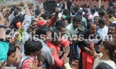 Photo Caption : Bharati Vishnuvardhan interacts with Vishnuvardhan fans, who were gathered to offer tribute to Late Actor Vishnuvardhan, celebrating his 64th birth anniversary at Abhiman Studio, in Bangalore on Thursday 18th September 2014