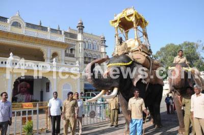 Photo Caption : First rehearsal of Jumboo Savari sans the procession with the dasara elephant Arjuna carrying the wooden replica of the golden howdah on its back and walking from Palace to torchlight parade grounds and back, in Mysore on Sunday 21st September 2014