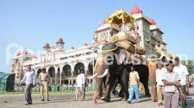 Photo Caption : First rehearsal of Jumboo Savari sans the procession with the dasara elephant Arjuna carrying the wooden replica of the golden howdah on its back and walking from Palace to torchlight parade grounds and back, in Mysore on Sunday 21st September 2014
