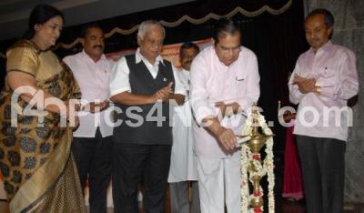 Photo Caption : Dr P Dayanand Pai, Entrepreneur with Madhura M Chatrapati, YV Gundu Rao, H Janardhan and others seen lighting lamp to inaugurate the Nagamma, Ravi Rohidekar and LG Shivkumar Award Ceremony, at Bharatiya Vidya Bhavan, in Bangalore on Sunday 21st September 2014