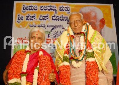 Event Description : Freedom Fighter HS Doreswamy with wife Lalitamma celebrate their 65th Marriage Anniversary, in Bangalore on Sunday 21st September 2014