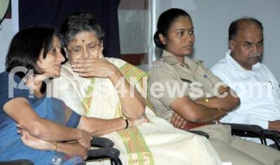 Photo Caption : Prof Mailini Bhattacharya, National President, Akhila Bharata Janavadi Mahila Sangatane with KS Vimala, State Vice President, Akila Bharata Janavadi Mahila Sangatane, Police Inspector Anjumala T Nayak and Prof KM Venakatashamireddy seen during the Discussion Programme on Atrocities on Women, at Government Arts College, in Bangalore on Tuesday 23rd September 2014