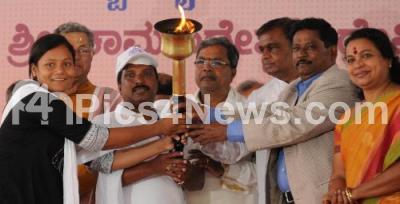 Photo Caption : K Siddaramaiah, Chief Minister with V Sreenivas Prasad, Mysore District incharge, Minister Umashree, Gnanpith Awardee Girish Karnad and Mountaineer Arunima Sinha burnt the Torch Light to inaugurate Dasara Sports, at Chamundeshwari Temple, in Mysore on Thursday 25th September 2014