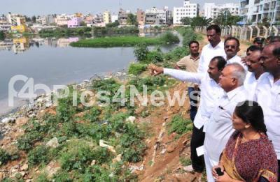 Photo Caption : Shantakumari, Mayor with K Ranganna, Deputy Mayor, Ramalinga Reddy, Bangalore District incharge, Satish Reddy, MLA and others inspecting Lakes in Bommanahalli Constitutency, in Bangalore on Thursday 25th September 2014