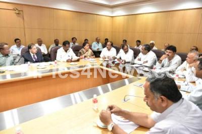Photo Caption : Chief Minister K Siddaramaiah chairing with Ministers KJ George, DK Shivakumar, R Roshan Baig, Ramalinga Reddy, Mayor Shanthakumari, Deputy Mayor Ranganna, BBMP Commissioner Lakshminarayana and Chief Secretary Kaushik Mukherjee, during the High Level Meeting on Rain Havoc, in Bangalore on Friday 26th September 2014