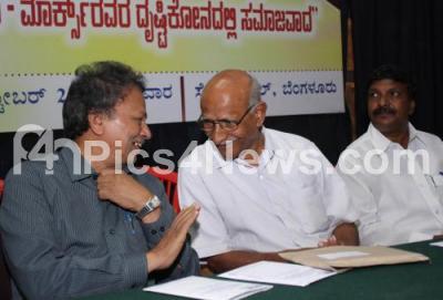 Photo Caption : Baraguru Ramachandrappa, Eminent Author and others seen discussing during the State Level Seminar on Gandhiji, Ambedkar, Lohia, Marks View on Socialism, organized by Communist Party of India (Marxist) at Senate Hall, in Bangalore on Wednesday 1st October 2014