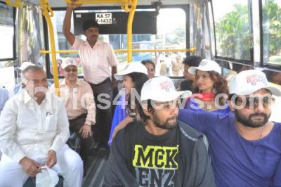 Photo Caption : Ramalinga Reddy, Transport Minister with Dr Ekroop Kaur, MD, BMTC, Uday Shankar, Councilor with Actors Srinagar Kitty and Dhruva Sarja observe Bus Day 2014 to ensure Maximum public participation, at Shantinagar Bus Stand, in Bangalore on Tuesday 7th October 2014