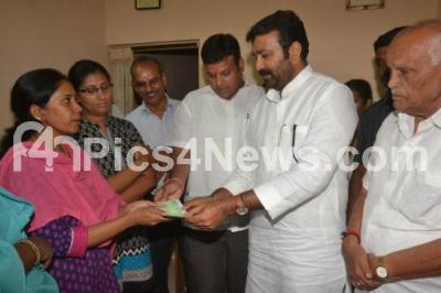 Photo Caption : NA Haris, MLA presenting cheque to Bharati, wife of Subramanya and mother of Kiran Sai Sadan, who died in building collapse due to heavy rain and Thunder Showers, at Jogupalya near Ulsoor, in Bangalore City on Monday 13th October 2014
