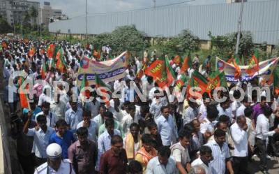 Photo Caption : Supporters of BJP with Members of Arecanut Growers and Farmers from North Karnataka partake in a rally, protesting to fulfill their various demands, at Freedom Park, in Bangalore on Thursday 16th October 2014