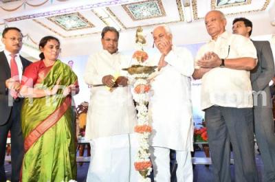 Photo Caption : K Siddaramaiah, Chief Minister with RV Deshpande, Higher Education Minister, SR Patil, IT BT Minister and others lighting lamp to launch New Industrial Policy 2014 to 2019, at Vidhana Soudha, in Bangalore on Friday 17th October 2014
