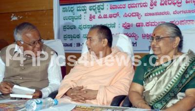 Event Description : Sri Veerabhadra Channamalla Swamiji discussing with former Minister PGR Sindhya and Dr Kamala Hampana during Pratiba Puraskara presentation to the toppers of MBBS, Engineering and B Sc students, organized by Valmiki Education and Scholarship Trust, at Gandhi Bhavan, in Bangalore on 19th of October 2014
