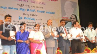 Puneeth Rajkumar with Parvathamma Rajkumar, KS Nisar Ahmed, Shivraj Kumar and others seen releasing the Life of Parvathamma Rajkumar Book, at Chowdaiah Memorial Hall, in Bangalore on Monday 20th October 2014