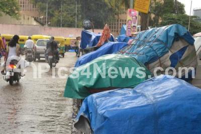 Photo Caption : Footpath Vendors cover their shops to avoid rain, as heavy rain showered in City, at Shivajinagar, in Bangalore on Thursday 23rd October 2014