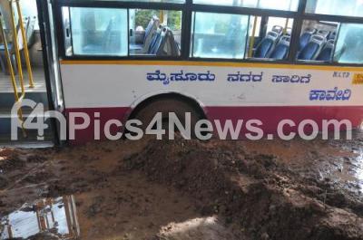 Event Description : Bus Stuck under the Muddy Road, due to recent rains in Mysore City on Thursday 23rd October 2014