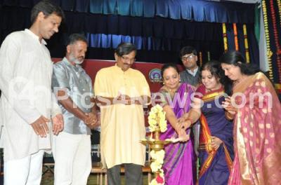 Photo Caption : Katti Kulkarni, Singer with Nalloor Prasad, Former President, Kannada Sahitya Parishat with Dr M Byregowda, Manjula Gururaj and others seen lighting lamp to inaugurate the State Level Da Ra Bendre Geetotsava (Da Ra Bendre Music Programme), organized by Sangeeta Sangama, at Kannada Sahitya Parishath, in Bangalore on Saturday 25th October 2014
