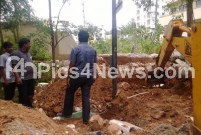 Event Description : BBMP demolishing the Compound wall, as it is built over Storm Water Drain, at Mantri Tranquil Apartment, Kanakpura Road, in Bangalore on Tuesday 28th October 2014