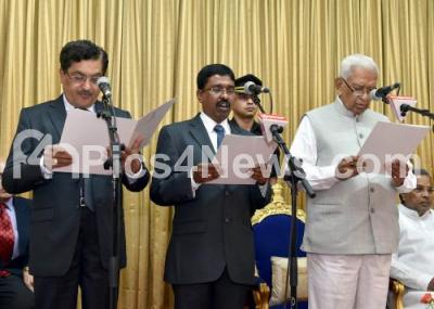 Photo Caption : Governor Vajubhai Rudabhai Vala administering oath to new RTI Commissioners L Krishna Murthy and Shankar R Patil, during the Swearing in ceremony, at Raj Bhavan, in Bangalore on Tuesday 28th October 2014