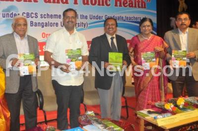 Photo Caption : UT Khader, Health Minister with Yellappa Reddy, Environmentalist, Justice HN Nagmohan Das, Prof KK Seethamma, Nithin Shah and others releasing souvenir, during the Orientation Programme on Environment and Public Health, at Jnana Jyoti Auditorium, in Bangalore on Wednesday 29th October 2014