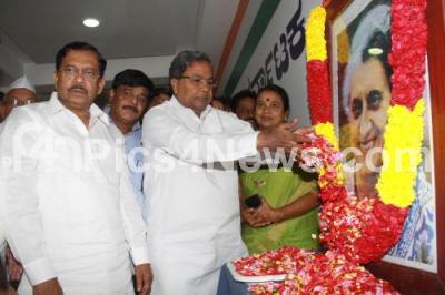 Photo Caption : K Siddaramaiah, Chief Minister with G Parmeshwar, KPCC President with Ministers HC Mahadevappa, Umashree offering floral tribute to Indira Gandhi to mark her 30th Death Anniversary, at KPCC, in Bangalore on Friday 31st October 2014