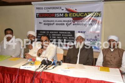 Photo Caption : Former Union Minister CM Ibrahim addressing with Sheik Aboobakar Muslyar, Zaini Kamil, Vice President, All India SSF and others seen during the Press Conference on Terrorism and Education, at Hotel Iris, in Bangalore on Friday 31st October 2014