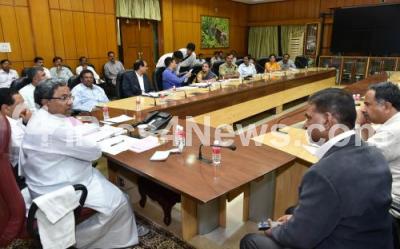 Photo Caption : Chief Minister K Siddaramaiah chairing a meeting with Kimmane Ratnakar, Minister For Primary and Secondary Education Department and officers, at Krishna, in Bangalore on 31st of October 2014