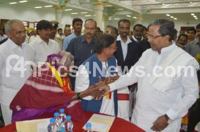 Photo Caption : K Siddaramaiah, Chief Minister with Umashree, Kannada and Cultural Minister seen interacting with Rajyotsava Awardees, during the Tea Party, at Banquet Hall, Vidhana Soudha, in Bengaluru on Saturday 1st November 2014