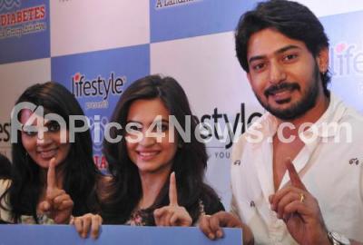 Photo Caption : Sandalwood actors Prajwal Devraj, Krithi Karbhanda and Sindhu Loknath pose for a photograph after getting a Diabetes test done, during the Beat Diabetes Initiative, at Lifestyle store, in Bengaluru on Thursday 6th November 2014