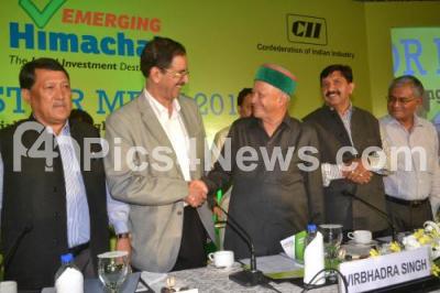 Photo Caption : Virbhadra Singh, Chief Minister, Government of Himachal Pradesh greeting Sudhakar Pai, Past Chairman, CII Karnataka State Council during the Investor Meet on Emerging Himachal, also seen Mukesh Agnihotri, Minister for Industries Labour and Employment, Government of Himachal Pradesh, at Hotel Taj Westend, in Bengaluru on Friday 7th November 2014