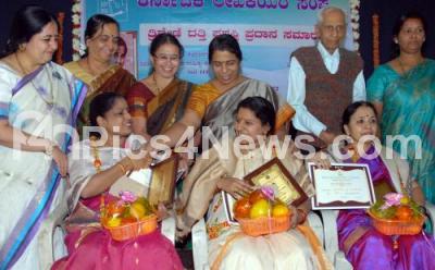 Photo Caption : Sa Shi Marulaiah presenting "Triveni Datti" award to Mangala Prasad, Madura Karnam and SP Vijayalakshmi, at an award presentation programme organised by Karnataka woman writers Association at Kannada Sahitya Parishat, also seen are Dr Vasundara Bhupati, President, Karnataka Lekakiyara woman writers Association and others, in Bengaluru on Sunday 9th November 2014