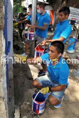 Photo Caption : Bangalore Football Club Players painting walls in and around Bangalore Football Stadium, participating in Swachh Bharat Abhiyan, in Bengaluru on Monday 10th November 2014