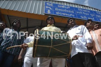 Members of Kannada Chalavali Vatal Paksha led by Vatal Nagaraj protesting against the Transfer of DV Sadananda Gowda from Railway Minister to Law Minister, the protest demonstration was held at City Railway Station, in Bengaluru on Sunday 16th November 2014