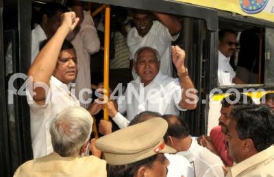 Photo Caption : BJP Leaders BS Yeddiyurappa, Jagadish Shettar being arrested during their protest against Congress Government demanding resignation of tainted ministers, at Vidhana Soudha, in Bengaluru on Thursday 20th November 2014