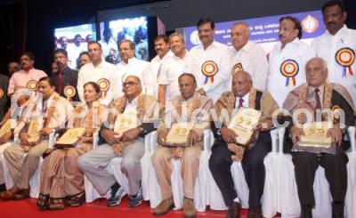 Photo Caption : Chief Minister K Siddaramaiah with Ministers Roshan Baig, Dinesh Gundu Rao and Ramalinga Reddy with MLAs Akhanda Sreenivasmurthy, Munirathna, Basavaran Bairathi and others felicitated the beneficiaries, during the Golden Jubilee Celebrations of BWSSB, at Jnana Jyoti Auditorium, in Bengaluru on Thursday 20th November 2014