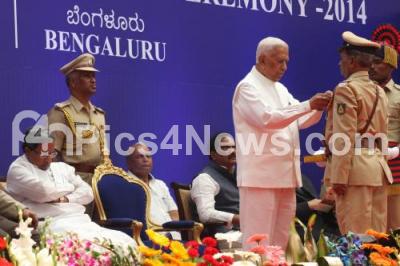 Photo Caption : Governor Vajubhai Rudabhai Vala presenting President Medal Award to Police Officer, during the President Medal Award Investiture Ceremony 2014, also seen Chief Minister K Siddaramaiah and Home Minister KJ George, at Raj Bhavan, in Bengaluru on Wednesday 26th November 2014