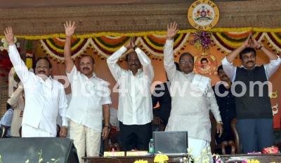 Photo Caption : K Siddaramaiah, Chief Minister with Actors Rajnikanth and Chiranjeevi with Union Minister DV Sadananda Gowda and Infrastructure Minister R Roshan baig waving hands to the public, during the inauguration of Dr Rajkumar Memorial, organized by Dr Rajkumar Pratishthana, at Kanteerva Studio, in Bengaluru on Saturday 29th November 2014