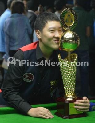 Photo Caption : Yan Bingtao, (China) Mens Champion kisses his Trophy, during the International Billiards and Snooker Federation Championship 2014, at Kanteerva Indoor Stadium, in Bengaluru on Saturday 29th November 2014