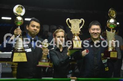 Photo Caption : Yan Bingtao, (China) Mens Champion with Wendy Jans (Belgium), Womens Champion and Phisit Chandsri (Thailand) Masters Champion seen with their trophies, during the International Billiards and Snooker Federation Championship 2014, at Kanteerva Indoor Stadium, in Bengaluru on Saturday 29th November 2014