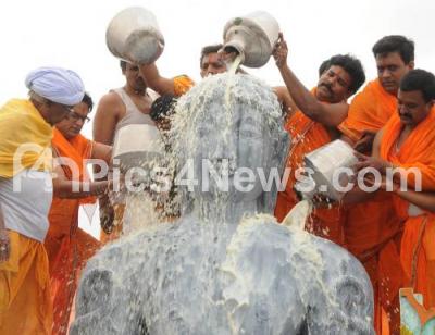 Photo Caption : Jain pilgrims offering Milk, celebrating 65th Mahamasthakabhishekha to Lord Gommateshwara Statue, at Gommatagiri, in Mysuru on Sunday 30th November 2014