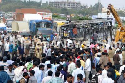 Fire blazing from the bus belonging to Sai Krishna Tours after the bus hits the divider, at KR Puram, leaving several injured, the bus was travelling from Chintamani to Kallasipalya, in Bengaluru on Tuesday 2nd December 2014