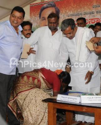 Photo Caption : Woman pays respect to Chief Minister K Siddaramaiah, while distributing Government Schemes to beneficiaries, during the inauguration of various developmental works, at Varuna Constituency, in Mysuru on Tuesday 2nd December 2014