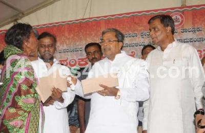 Photo Caption : Chief Minister K Siddaramaiah with Revenue Minister Sreenivas Prasad and others distributing Government Schemes to beneficiaries, during the inauguration of various developmental works, at Varuna Constituency, in Mysuru on Tuesday 2nd December 2014