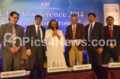 Photo Caption : Sri Ravi Shankar, Founder, Art of Living greeting with Sandeep K Maini, Chairman, CII Karnataka, Saumen Chakraborty, President and CFO, De Reddy Laboratories, G Madhusudhan Rao, during the Annual CFO Conference 2014 Gearing for Growth, organized by Confederation of Indian Industry, at Hotel Chancery Pavilion, in Bengaluru on Friday 5th December 2014