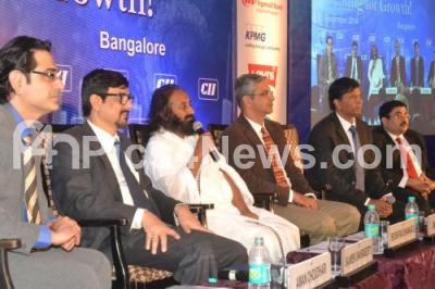 Sri Ravi Shankar, Founder, Art of Living addressing with Sandeep K Maini, Chairman, CII Karnataka, Saumen Chakraborty, President and CFO, De Reddy Laboratories, G Madhusudhan Rao, during the Annual CFO Conference 2014 Gearing for Growth, organized by Confederation of Indian Industry, at Hotel Chancery Pavilion, in Bengaluru on Friday 5th December 2014