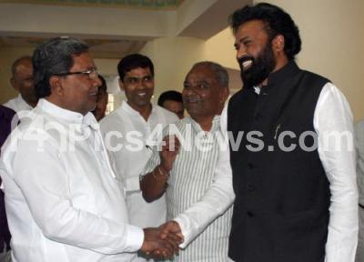 Photo Caption : K Siddaramaiah, Chief Minister seen greeting Sriramulu, during the Assembly Session at Suvarna Soudha, at Belgavi on Tuesday 9th December 2014