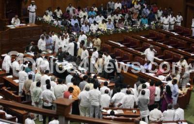 Photo Caption : Congress MLAs and BJP MLAs troop in a well, discussing over the BJP MLA Prabhu Chavan over the Mobile Issue, during the Assembly Session at Suvarna Soudha, in Belagavi on Thursday 11th December 2014
