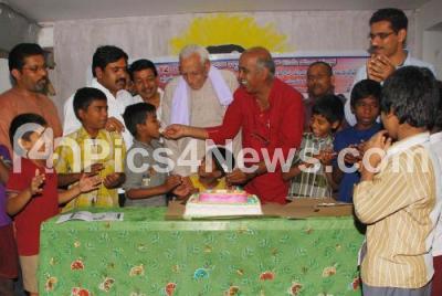 Photo Caption : Freedom Fighter HS Doreswamy participates with Karnataka State Savita Samaj distributing cake to orphans, celebrating 65th Birthday of Superstar Rajnikanth, at Bosco House, in Bengaluru on Thursday 11th December 2014
