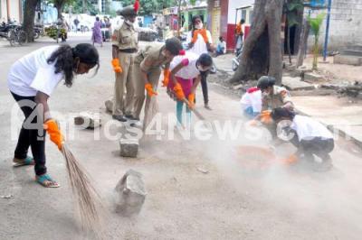 NCC Cadets and others seen cleaning streets, participating in Swach Bharat Abhiyan, at Kormanagala, in Bengaluru on Thursday 11th December 2014